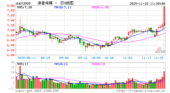 传媒股异动拉升,读客文化涨超10%,掌阅科技涨超7%,读者传媒、中国出版、中信出版、中文在线、果麦文化等跟涨。